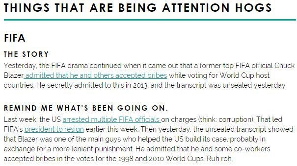 That’s where theSkimm comes to the rescue. theSkimm is a free email subscription that will send you one email each weekday morning with bite-size summaries of the most important news written in a fun and easy-to-understand format. It only takes a few minutes to skim through, (get it?) so you won’t be the odd man out when everyone around the water cooler is discussing the FIFA scandal.