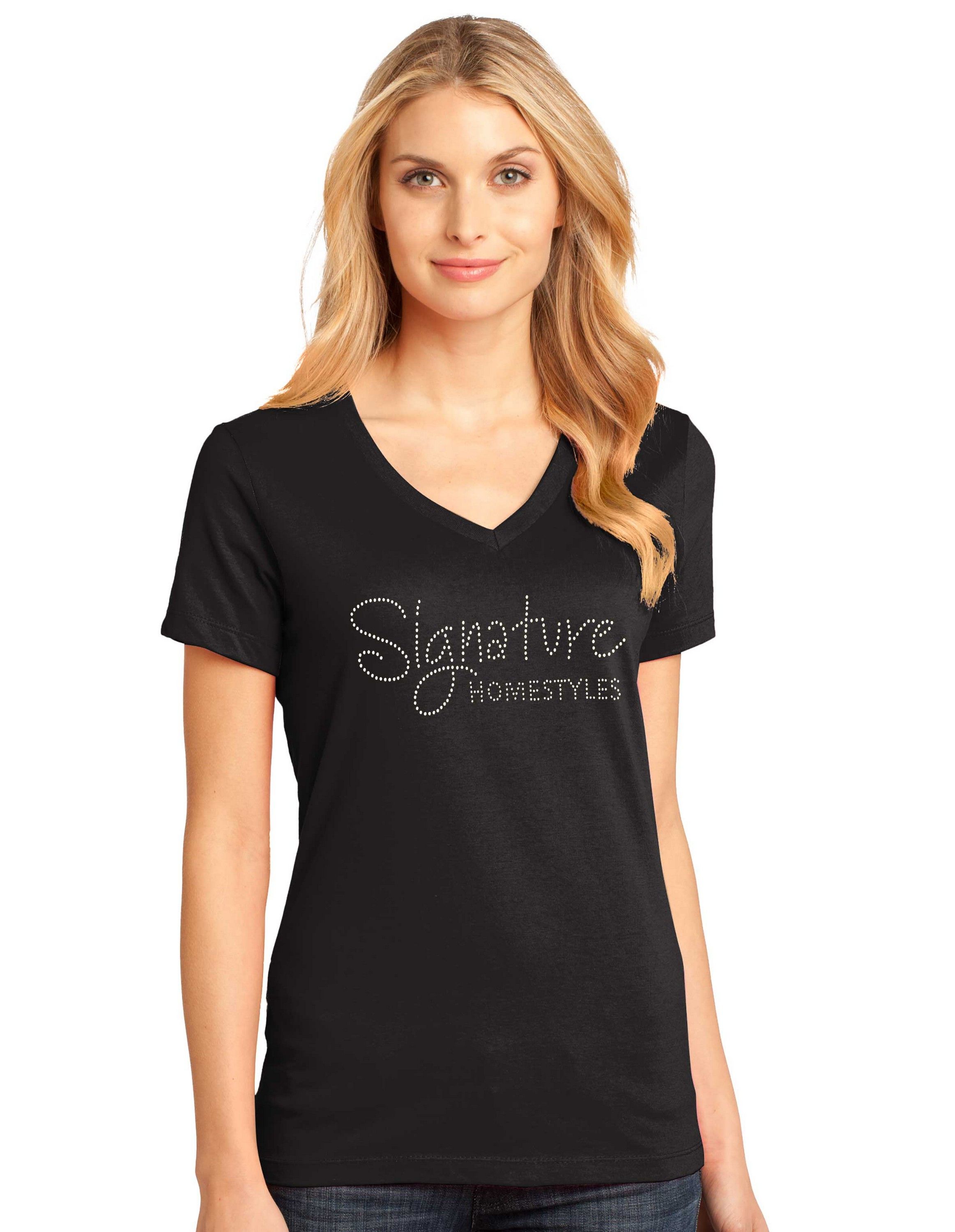 This rhinestone t-shirt is perfect for your brand, team, or event! The Perfect Weight® v-neck tee has a 1,000 count rhinestone logo, with up to two colors. An additional fee will incur for designs that use more than 1,000 stones. Please allow two to three weeks for production. Sizes are available from XS-XL.