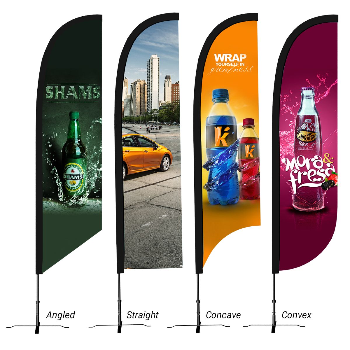 Stop customers in their tracks with colorful feather flags that can help promote brands and businesses in a bold way. From bars to retail stores, flags offer great visibility and are the perfect solution to let bystanders know that the doors are open! Plus, the unique shape of the flags allows them to move with the wind. They can turn a full 360-degrees, which increases readability from all sides.